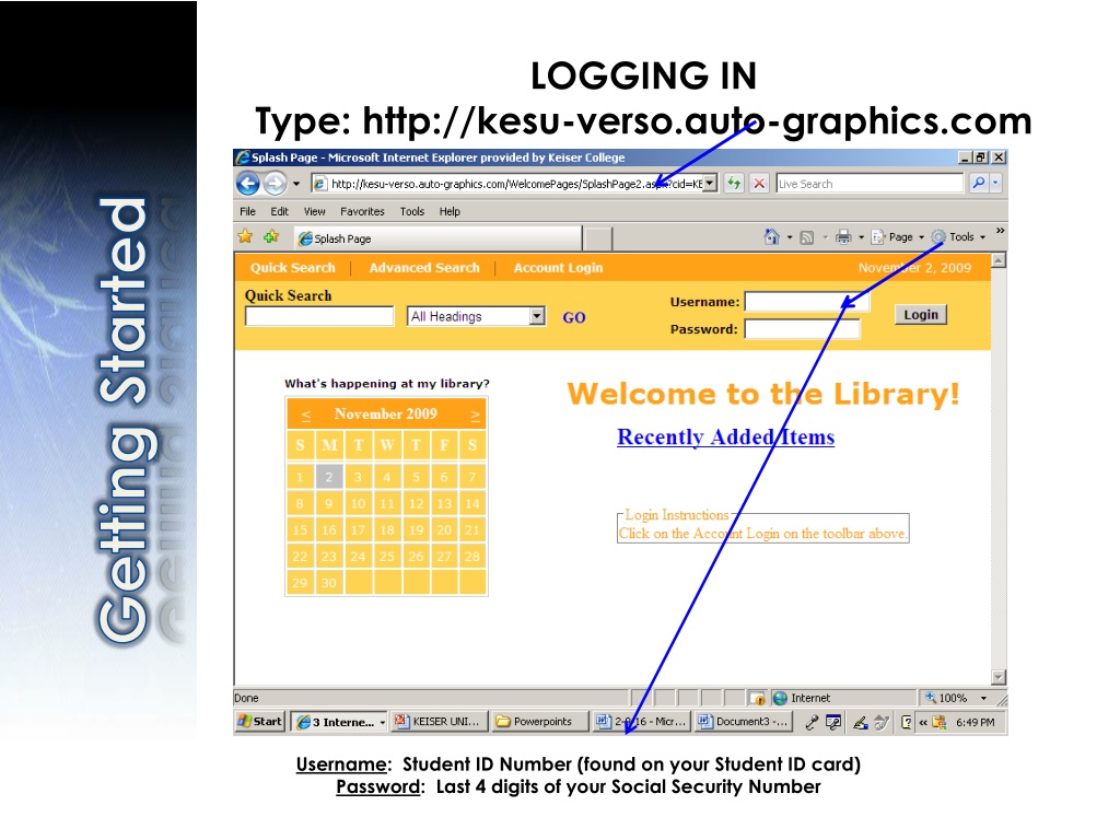 LOGGING IN Type: http://kesu-verso.auto-graphics.com Getting Started Username: Student ID Number (found on your Student ID card) Password: Last 4 digits of your Social Security Number