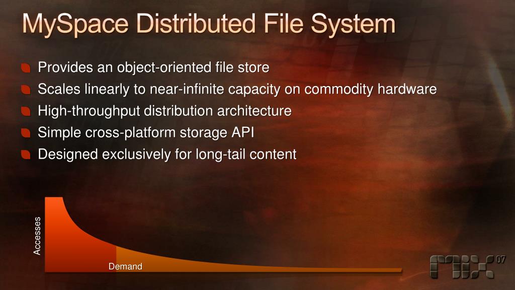 MySpace Distributed File System • Provides an object-oriented file store • Scales linearly to near-infinite capacity on commodity hardware • High-throughput distribution architecture • Simple cross-platform storage API • Designed exclusively for long-tail content • Accesses • Demand