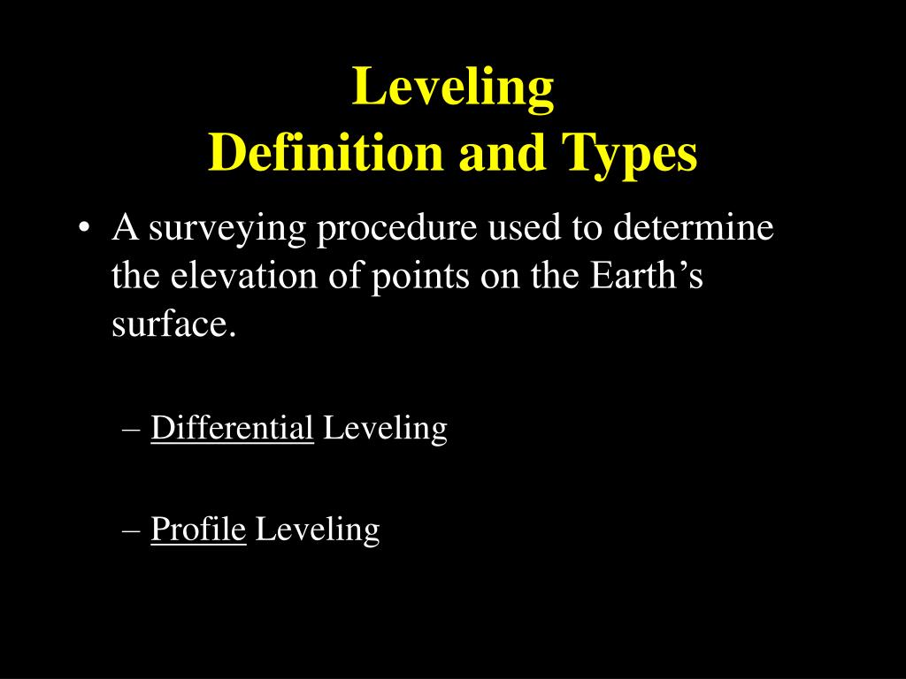 Leveling Definition and Types • A surveying procedure used to determine the elevation of points on the Earth’s surface. • Differential Leveling • Profile Leveling