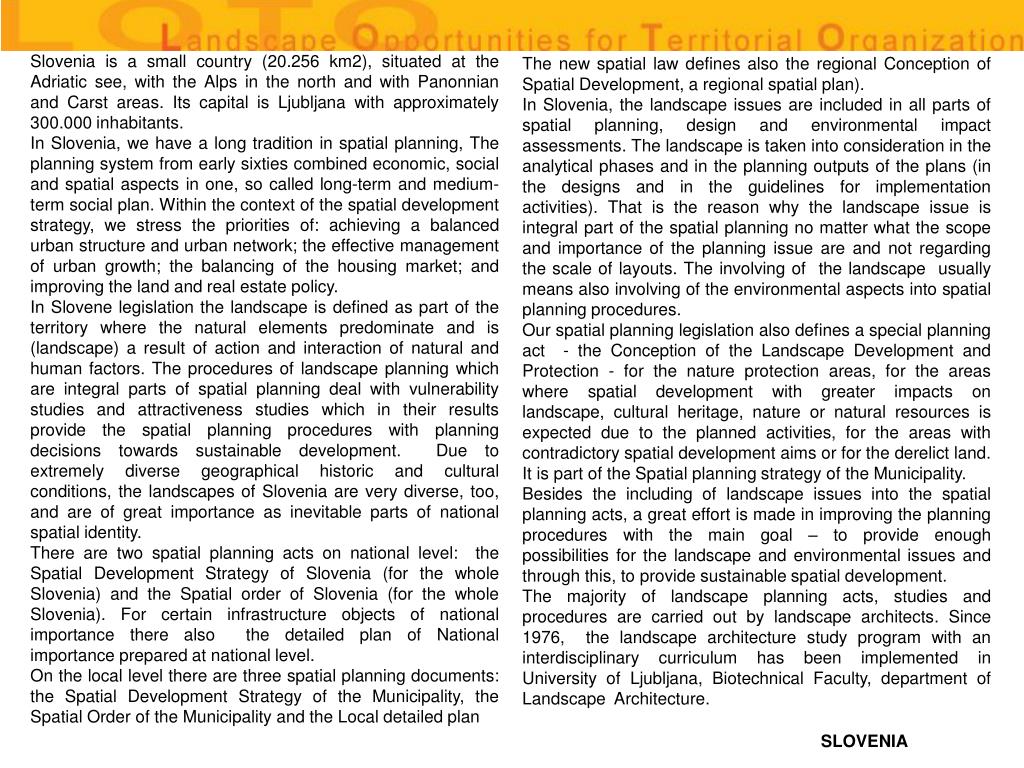 Slovenia is a small country (20.256 km2), situated at the Adriatic see, with the Alps in the north and with Panonnian and Carst areas. Its capital is Ljubljana with approximately 300.000 inhabitants. In Slovenia, we have a long tradition in spatial planning, The planning system from early sixties combined economic, social and spatial aspects in one, so called long-term and medium-term social plan. Within the context of the spatial development strategy, we stress the priorities of: achieving a balanced urban structure and urban network; the effective management of urban growth; the balancing of the housing market; and improving the land and real estate policy. In Slovene legislation the landscape is defined as part of the territory where the natural elements predominate and is (landscape) a result of action and interaction of natural and human factors. The procedures of landscape planning which are integral parts of spatial planning deal with vulnerability studies and attractiveness studies which in their results provide the spatial planning procedures with planning decisions towards sustainable development. Due to extremely diverse geographical historic and cultural conditions, the landscapes of Slovenia are very diverse, too, and are of great importance as inevitable parts of national spatial identity. There are two spatial planning acts on national level: the Spatial Development Strategy of Slovenia (for the whole Slovenia) and the Spatial order of Slovenia (for the whole Slovenia). For certain infrastructure objects of national importance there also the detailed plan of National importance prepared at national level. On the local level there are three spatial planning documents: the Spatial Development Strategy of the Municipality, the Spatial Order of the Municipality and the Local detailed plan The new spatial law defines also the regional Conception of Spatial Development, a regional spatial plan). In Slovenia, the landscape issues are included in all parts of spatial planning, design and environmental impact assessments. The landscape is taken into consideration in the analytical phases and in the planning outputs of the plans (in the designs and in the guidelines for implementation activities). That is the reason why the landscape issue is integral part of the spatial planning no matter what the scope and importance of the planning issue are and not regarding the scale of layouts. The involving of the landscape usually means also involving of the environmental aspects into spatial planning procedures. Our spatial planning legislation also defines a special planning act - the Conception of the Landscape Development and Protection - for the nature protection areas, for the areas where spatial development with greater impacts on landscape, cultural heritage, nature or natural resources is expected due to the planned activities, for the areas with contradictory spatial development aims or for the derelict land. It is part of the Spatial planning strategy of the Municipality. Besides the including of landscape issues into the spatial planning acts, a great effort is made in improving the planning procedures with the main goal – to provide enough possibilities for the landscape and environmental issues and through this, to provide sustainable spatial development. The majority of landscape planning acts, studies and procedures are carried out by landscape architects. Since 1976, the landscape architecture study program with an interdisciplinary curriculum has been implemented in University of Ljubljana, Biotechnical Faculty, department of Landscape Architecture.