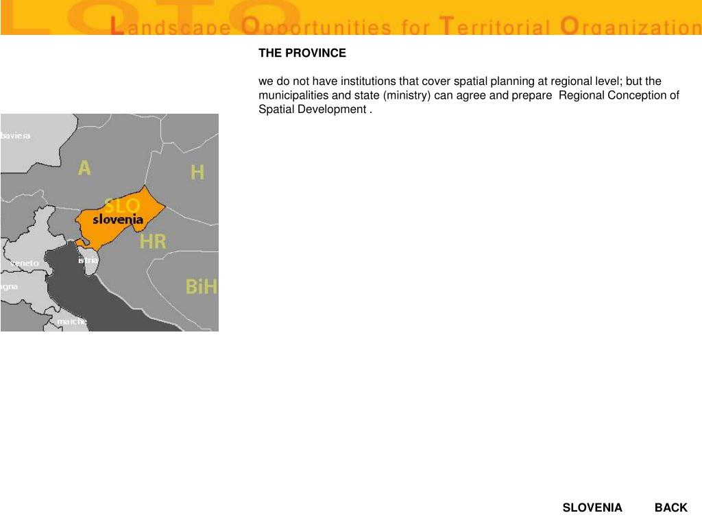THE PROVINCE we do not have institutions that cover spatial planning at regional level; but the municipalities and state (ministry) can agree and prepare Regional Conception of Spatial Development . BACK