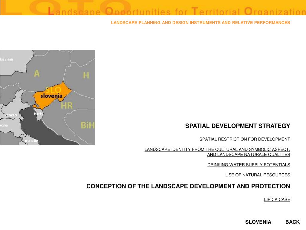 LANDSCAPE PLANNING AND DESIGN INSTRUMENTS AND RELATIVE PERFORMANCES SPATIAL DEVELOPMENT STRATEGY SPATIAL RESTRICTION FOR DEVELOPMENT LANDSCAPE IDENTITY FROM THE CULTURAL AND SYMBOLIC ASPECT, AND LANDSCAPE NATURALE QUALITIES DRINKING WATER SUPPLY POTENTIALS USE OF NATURAL RESOURCES CONCEPTION OF THE LANDSCAPE DEVELOPMENT AND PROTECTION LIPICA CASE BACK