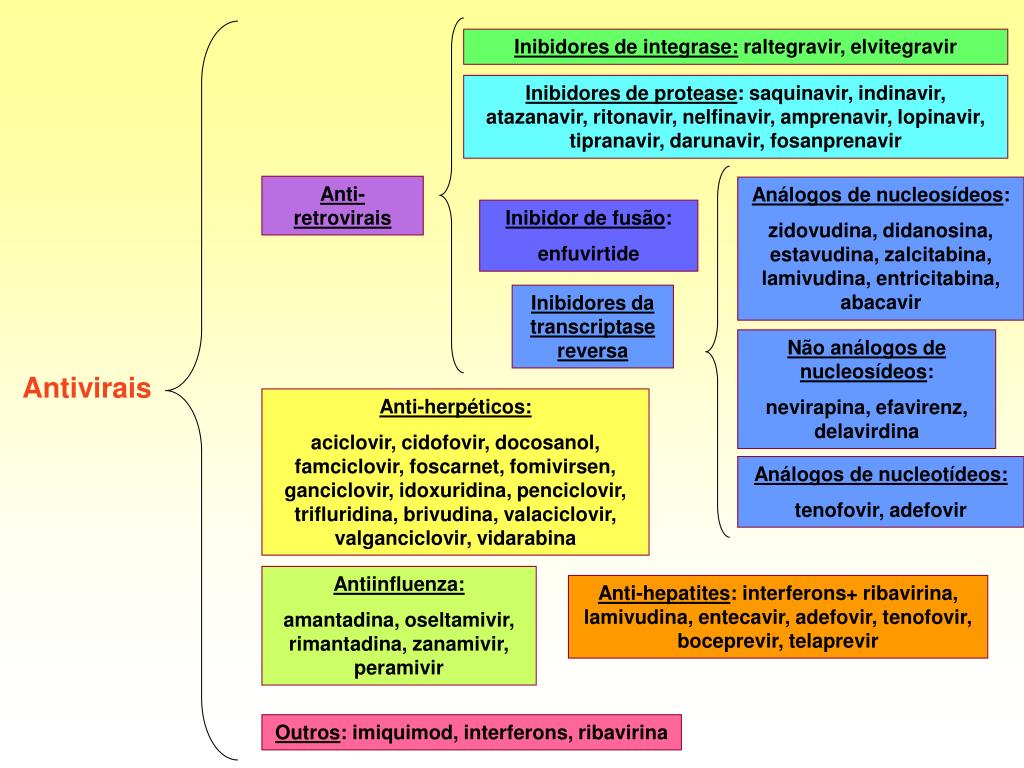 Inibidores de integrase: raltegravir, elvitegravir Inibidores de protease: saquinavir, indinavir, atazanavir, ritonavir, nelfinavir, amprenavir, lopinavir, tipranavir, darunavir, fosanprenavir Anti-retrovirais Análogos de nucleosídeos: zidovudina, didanosina, estavudina, zalcitabina, lamivudina, entricitabina, abacavir Inibidor de fusão: enfuvirtide Inibidores da transcriptase reversa Não análogos de nucleosídeos: nevirapina, efavirenz, delavirdina Antivirais Anti-herpéticos: aciclovir, cidofovir, docosanol, famciclovir, foscarnet, fomivirsen, ganciclovir, idoxuridina, penciclovir, trifluridina, brivudina, valaciclovir, valganciclovir, vidarabina Análogos de nucleotídeos: tenofovir, adefovir Antiinfluenza: amantadina, oseltamivir, rimantadina, zanamivir, peramivir Anti-hepatites: interferons+ ribavirina, lamivudina, entecavir, adefovir, tenofovir, boceprevir, telaprevir Outros: imiquimod, interferons, ribavirina