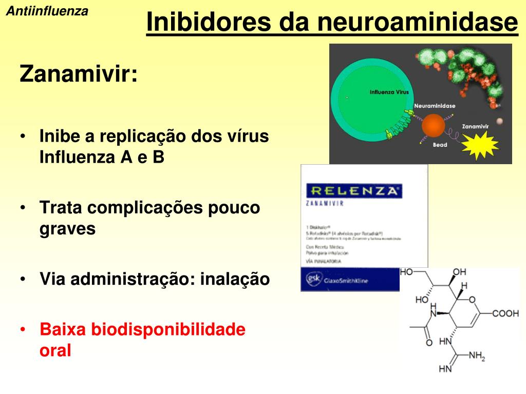Antiinfluenza Inibidores da neuroaminidase Zanamivir: • Inibe a replicação dos vírus Influenza A e B • Trata complicações pouco graves • Via administração: inalação • Baixa biodisponibilidade oral