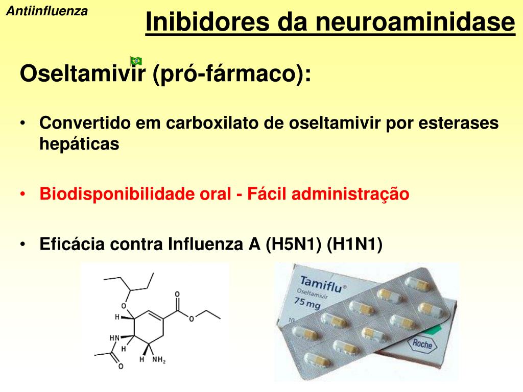 Antiinfluenza Inibidores da neuroaminidase Oseltamivir (pró-fármaco): • Convertido em carboxilato de oseltamivir por esterases hepáticas • Biodisponibilidade oral - Fácil administração • Eficácia contra Influenza A (H5N1) (H1N1)
