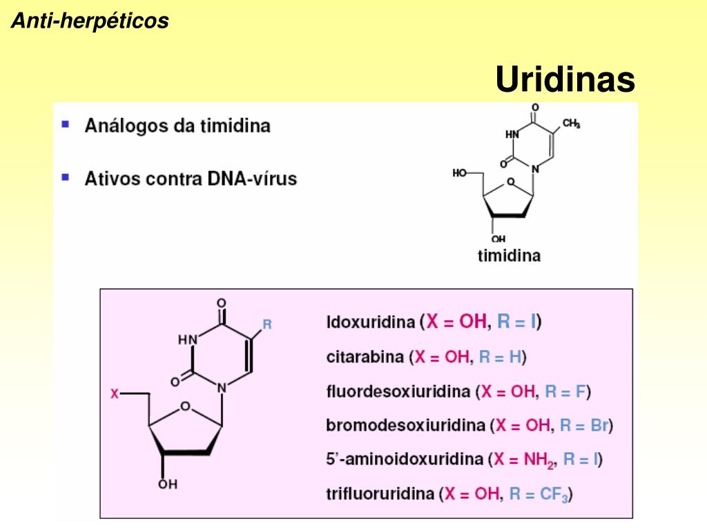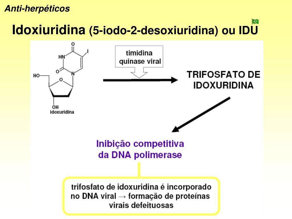 Idoxiuridina ou IDU: • Kaufmann et al.(1962) • Tratamento da queratite por HSV, cura de até 75%. • Mecanismo de ação: incorporação de sua fração trifosfato ao DNA viral, diminuindo a produção do vírion. • Por ser pouco seletiva, compromete também o DNA das células do hospedeiro, produzindo vários efeitos colaterais • Nome comercial: Herpesine® (Nikko)