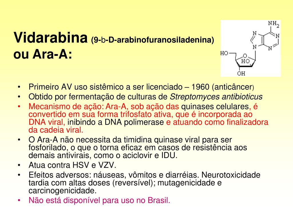 Vidarabina(9-b-D-arabinofuranosiladenina)ou Ara-A: • Primeiro AV uso sistêmico a ser licenciado – 1960 (anticâncer) • Obtido por fermentação de culturas de Streptomyces antibioticus • Mecanismo de ação:Ara-A, sob ação das quinases celulares, é convertido em sua forma trifosfato ativa, que é incorporada ao DNA viral, inibindo a DNA polimerase e atuando como finalizadora da cadeia viral. • O Ara-A não necessita da timidina quinase viral para ser fosforilado, o que o torna eficaz em casos de resistência aos demais antivirais, como o aciclovir e IDU. • Atua contra HSV e VZV. • Efeitos adversos: náuseas, vômitos e diarréias. Neurotoxicidade tardia com altas doses (reversível); mutagenicidade e carcinogenicidade. • Não está disponível para uso no Brasil.