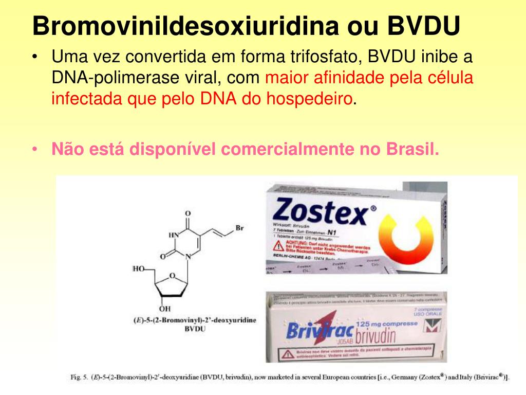 Bromovinildesoxiuridina ou BVDU • Uma vez convertida em forma trifosfato, BVDU inibe a DNA-polimerase viral, com maior afinidade pela célula infectada que pelo DNA do hospedeiro. • Não está disponível comercialmente no Brasil.