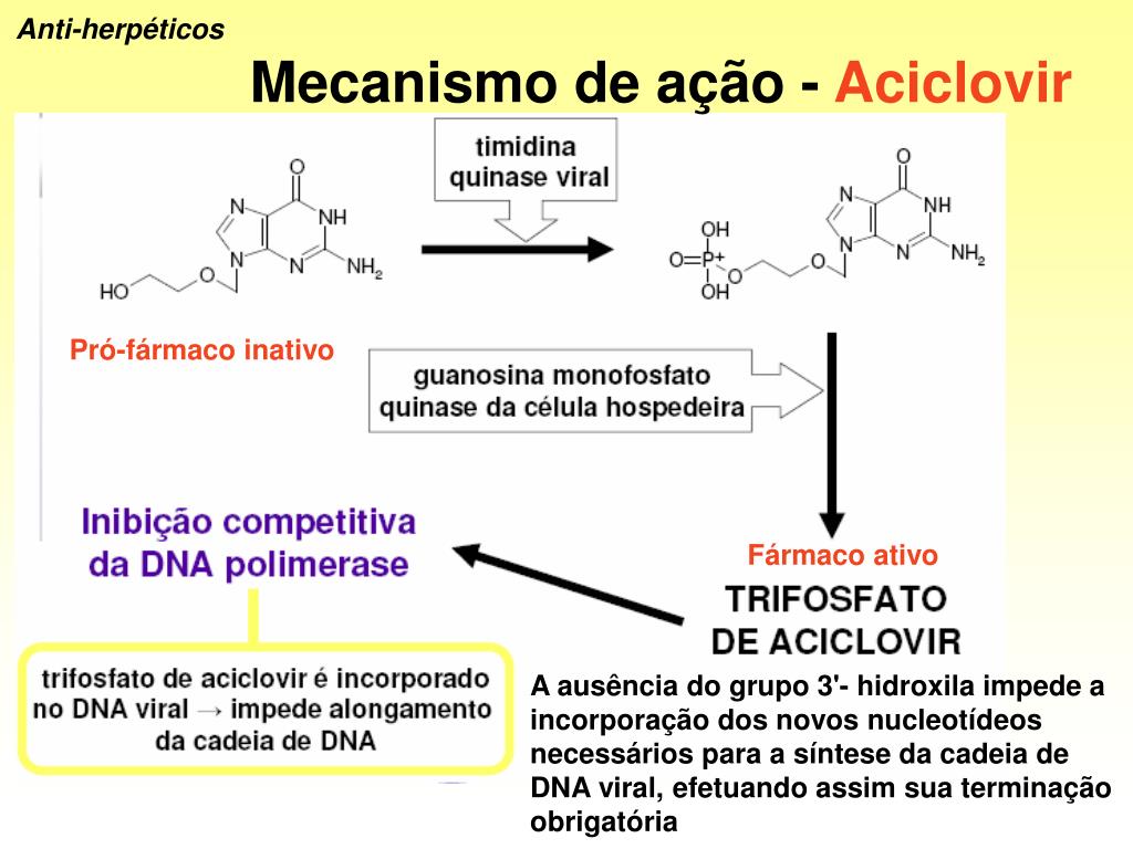 Anti-herpéticos Mecanismo de ação - Aciclovir Pró-fármaco inativo Fármaco ativo A ausência do grupo 3'- hidroxila impede a incorporação dos novos nucleotídeos necessários para a síntese da cadeia de DNA viral, efetuando assim sua terminação obrigatória