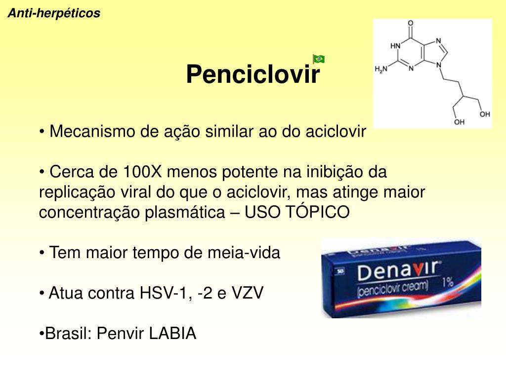 Anti-herpéticos Penciclovir • Mecanismo de ação similar ao do aciclovir • Cerca de 100X menos potente na inibição da replicação viral do que o aciclovir, mas atinge maior concentração plasmática – USO TÓPICO • Tem maior tempo de meia-vida • Atua contra HSV-1, -2 e VZV • Brasil: Penvir LABIA