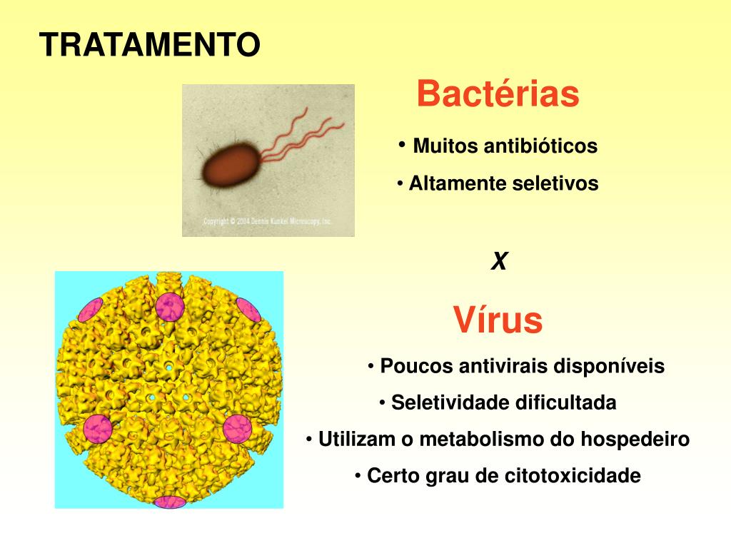 TRATAMENTO • Bactérias • Muitos antibióticos • Altamente seletivos • X • Vírus • Poucos antivirais disponíveis • Seletividade dificultada • Utilizam o metabolismo do hospedeiro • Certo grau de citotoxicidade