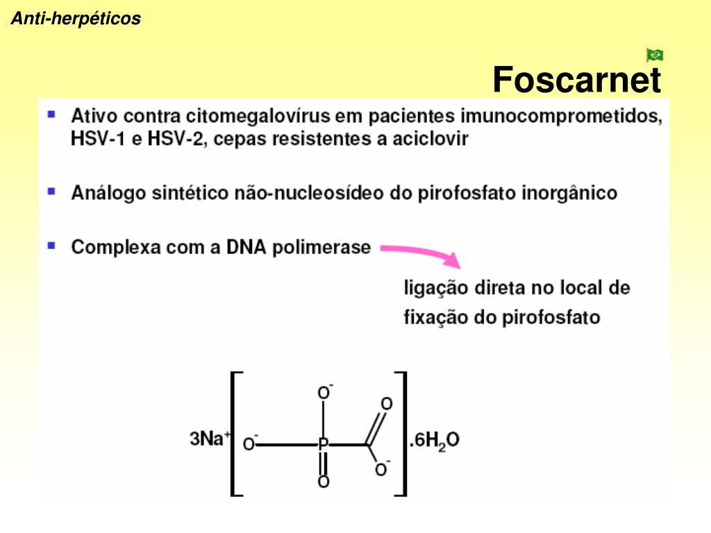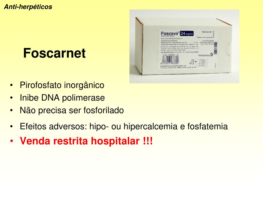 Anti-herpéticos Foscarnet • Pirofosfato inorgânico • Inibe DNA polimerase • Não precisa ser fosforilado • Efeitos adversos: hipo- ou hipercalcemia e fosfatemia • Venda restrita hospitalar !!!