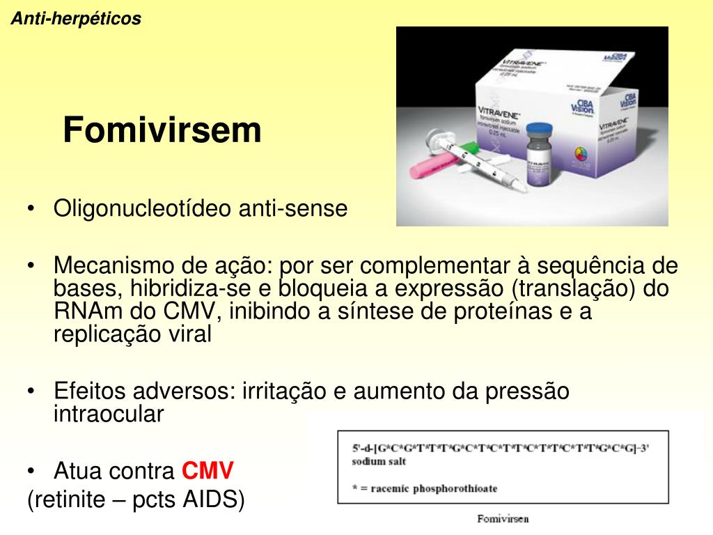 Anti-herpéticos Fomivirsem • Oligonucleotídeo anti-sense • Mecanismo de ação: por ser complementar à sequência de bases, hibridiza-se e bloqueia a expressão (translação) do RNAm do CMV, inibindo a síntese de proteínas e a replicação viral • Efeitos adversos: irritação e aumento da pressão intraocular • Atua contra CMV (retinite – pcts AIDS)