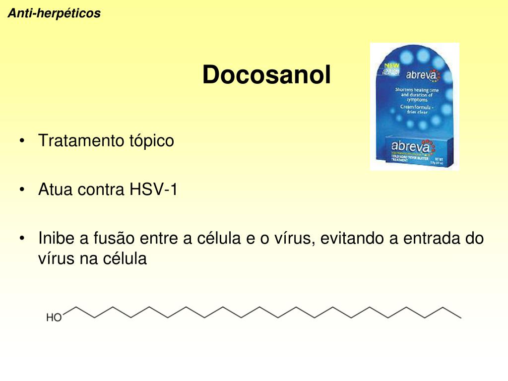 Anti-herpéticos Docosanol • Tratamento tópico • Atua contra HSV-1 • Inibe a fusão entre a célula e o vírus, evitando a entrada do vírus na célula