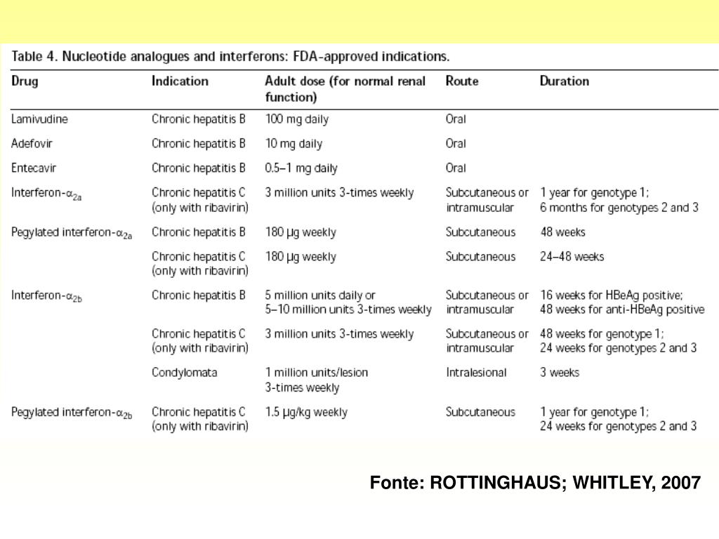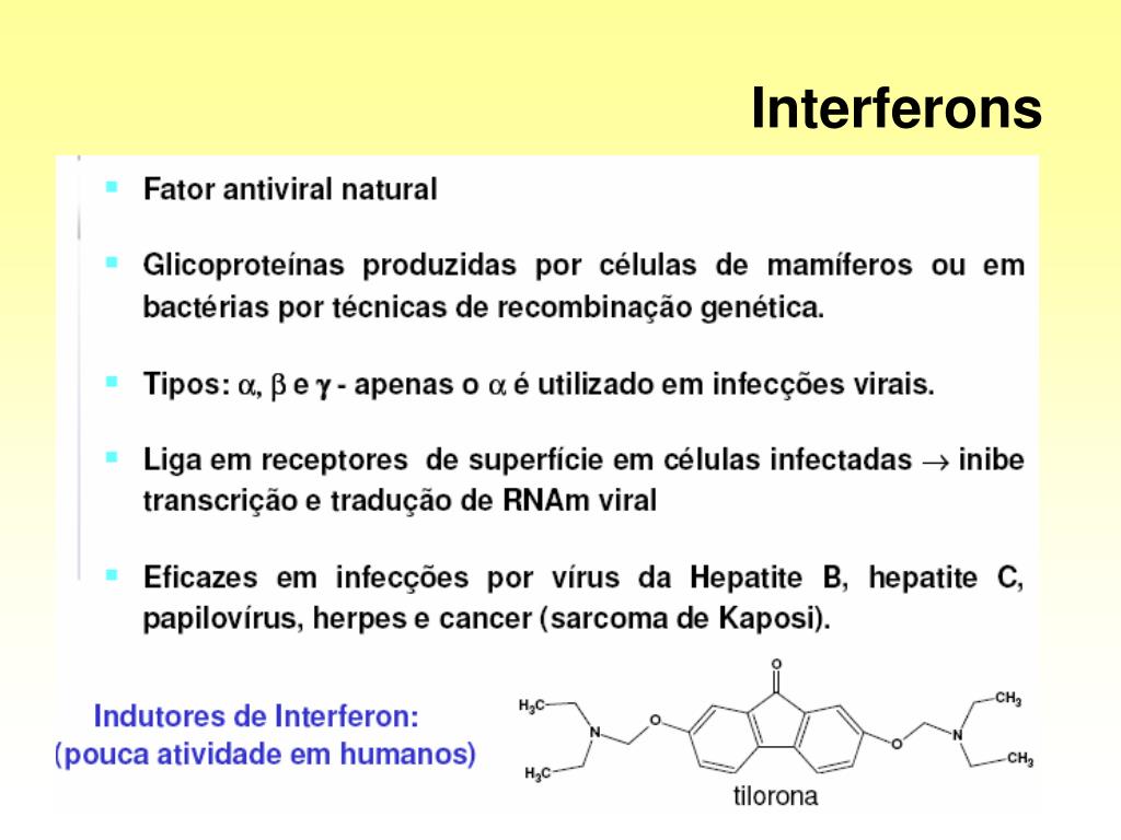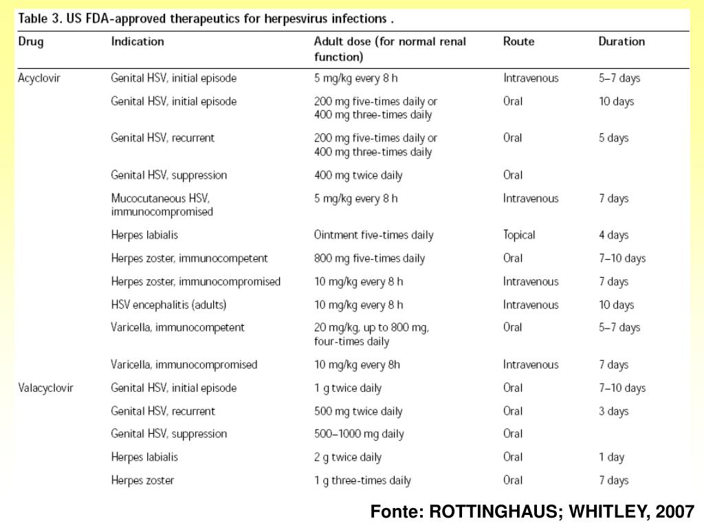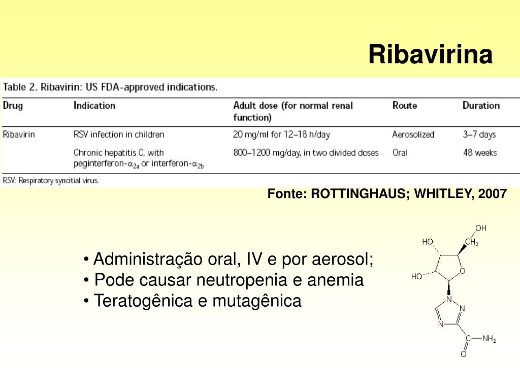Ribavirina Fonte: ROTTINGHAUS; WHITLEY, 2007 • Administração oral, IV e por aerosol; • Pode causar neutropenia e anemia • Teratogênica e mutagênica