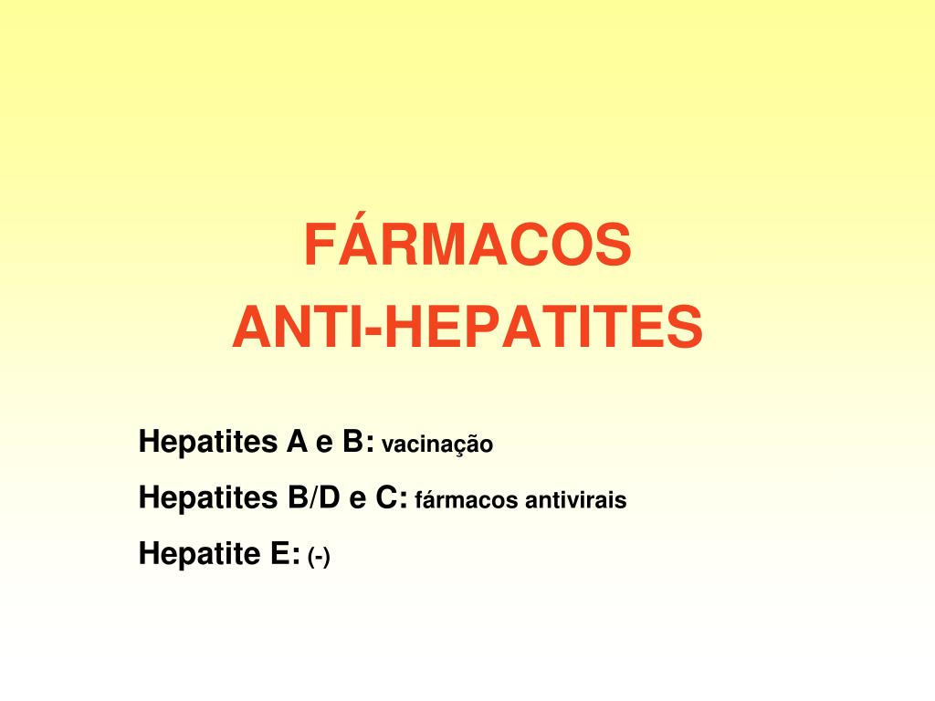 FÁRMACOS ANTI-HEPATITES Hepatites A e B: vacinação Hepatites B/D e C: fármacos antivirais Hepatite E: (-)