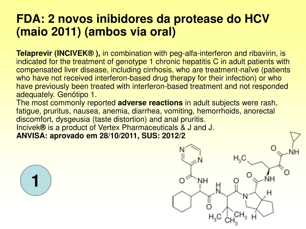 FDA: 2 novos inibidores da protease do HCV (maio 2011) (ambos via oral) Telaprevir (INCIVEK® ), in combination with peg-alfa-interferon and ribavirin, is indicated for the treatment of genotype 1 chronic hepatitis C in adult patients with compensated liver disease, including cirrhosis, who are treatment-naïve (patients who have not received interferon-based drug therapy for their infection) or who have previously been treated with interferon-based treatment and not responded adequately. Genótipo 1. The most commonly reported adverse reactions in adult subjects were rash, fatigue, pruritus, nausea, anemia, diarrhea, vomiting, hemorrhoids, anorectal discomfort, dysgeusia (taste distortion) and anal pruritis. Incivek® is a product of Vertex Pharmaceuticals & J and J. ANVISA: aprovado em 28/10/2011, SUS: 2012/2 1
