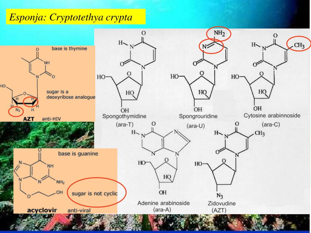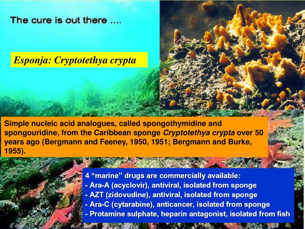 Esponja: Cryptotethya crypta Simple nucleic acid analogues, called spongothymidine and spongouridine, from the Caribbean sponge Cryptotethya crypta over 50 years ago (Bergmann and Feeney, 1950, 1951; Bergmann and Burke, 1955).
