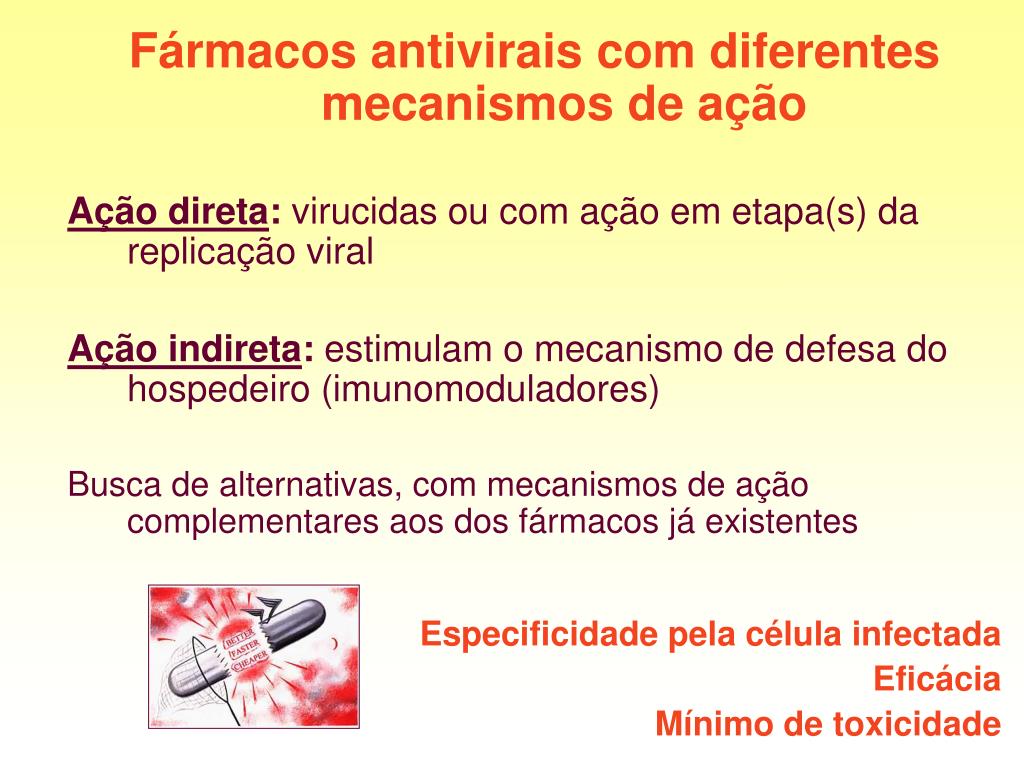 Fármacosantivirais com diferentesmecanismos de ação Ação direta:virucidas ou com ação em etapa(s) da replicação viral Ação indireta: estimulam o mecanismo de defesa do hospedeiro (imunomoduladores) Busca de alternativas, com mecanismos de ação complementares aos dos fármacos já existentes Especificidade pela célula infectada Eficácia Mínimo de toxicidade