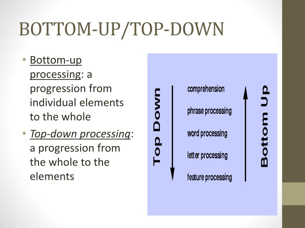BOTTOM-UP/TOP-DOWN • Bottom-up processing: a progression from individual elements to the whole • Top-down processing: a progression from the whole to the elements