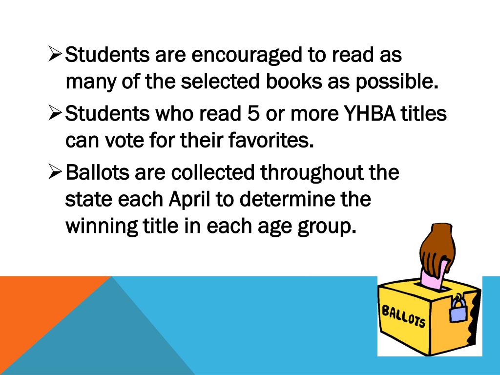Students are encouraged to read as many of the selected books as possible. • Students who read 5 or more YHBA titles can vote for their favorites. • Ballots are collected throughout the state each April to determine the winning title in each age group.