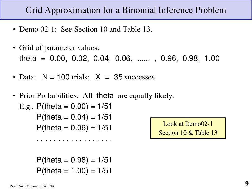 Grid Approximation for a Binomial Inference Problem • Demo 02-1: See Section 10 and Table 13. • Grid of parameter values:theta = 0.00, 0.02, 0.04, 0.06, ...... , 0.96, 0.98, 1.00 • Data: N = 100 trials; X = 35 successes • Prior Probabilities: All theta are equally likely. E.g., P(theta = 0.00) = 1/51 P(theta = 0.04) = 1/51 P(theta = 0.06) = 1/51 . . . . . . . . . . . . . . . . . . P(theta = 0.98) = 1/51 P(theta = 1.00) = 1/51 Look at Demo02-1Section 10 & Table 13 Psych 548, Miyamoto, Win '14