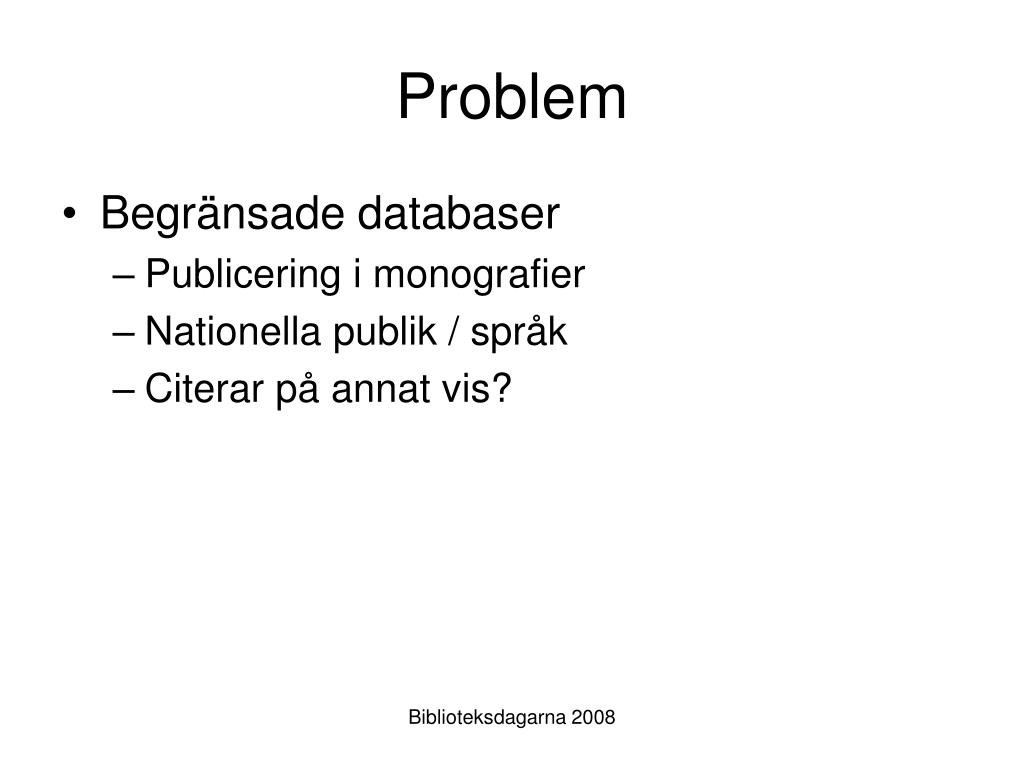 Problem • Begränsade databaser • Publicering i monografier • Nationella publik / språk • Citerar på annat vis? Biblioteksdagarna 2008