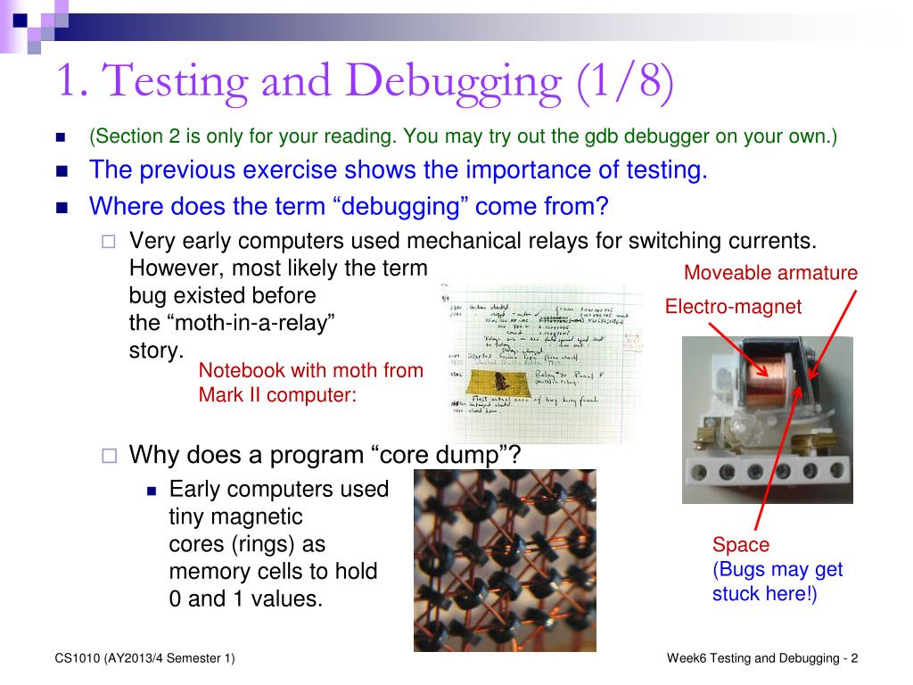 1. Testing and Debugging (1/8) • (Section 2 is only for your reading. You may try out the gdb debugger on your own.) • The previous exercise shows the importance of testing. • Where does the term “debugging” come from? • Very early computers used mechanical relays for switching currents. However, most likely the termbug existed beforethe “moth-in-a-relay”story. • Why does a program “core dump”? • Early computers usedtiny magneticcores (rings) asmemory cells to hold0 and 1 values. Moveable armature Electro-magnet Notebook with moth fromMark II computer: Space (Bugs may get stuck here!) CS1010 (AY2013/4 Semester 1)