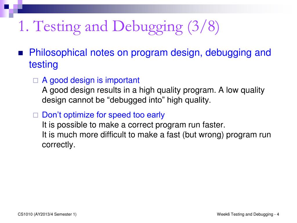 1. Testing and Debugging (3/8) • Philosophical notes on program design, debugging and testing • A good design is importantA good design results in a high quality program. A low quality design cannot be “debugged into” high quality. • Don’t optimize for speed too earlyIt is possible to make a correct program run faster.It is much more difficult to make a fast (but wrong) program run correctly. CS1010 (AY2013/4 Semester 1)