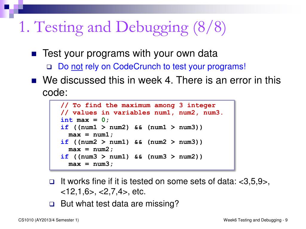 1. Testing and Debugging (8/8) • Test your programs with your own data • Do not rely on CodeCrunchto test your programs! • We discussed this in week 4. There is an error in this code: // To find the maximum among 3 integer// values in variables num1, num2, num3.int max = 0;if((num1 > num2) && (num1 > num3)) max = num1;if((num2 > num1) && (num2 > num3)) max = num2;if((num3 > num1) && (num3 > num2)) max = num3; • It works fine if it is tested on some sets of data: <3,5,9>, <12,1,6>, <2,7,4>, etc. • But what test data are missing? CS1010 (AY2013/4 Semester 1)