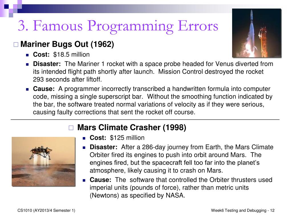 3. Famous Programming Errors • Mariner Bugs Out (1962) • Cost: $18.5 million • Disaster: The Mariner 1 rocket with a space probe headed for Venus diverted from its intended flight path shortly after launch. Mission Control destroyed the rocket 293 seconds after liftoff. • Cause: A programmer incorrectly transcribed a handwritten formula into computer code, missing a single superscript bar. Without the smoothing function indicated by the bar, the software treated normal variations of velocity as if they were serious, causing faulty corrections that sent the rocket off course. • Mars Climate Crasher (1998) • Cost: $125 million • Disaster: After a 286-day journey from Earth, the Mars Climate Orbiter fired its engines to push into orbit around Mars. The engines fired, but the spacecraft fell too far into the planet’s atmosphere, likely causing it to crash on Mars. • Cause: The software that controlled the Orbiter thrusters used imperial units (pounds of force), rather than metric units (Newtons) as specified by NASA. CS1010 (AY2013/4 Semester 1)