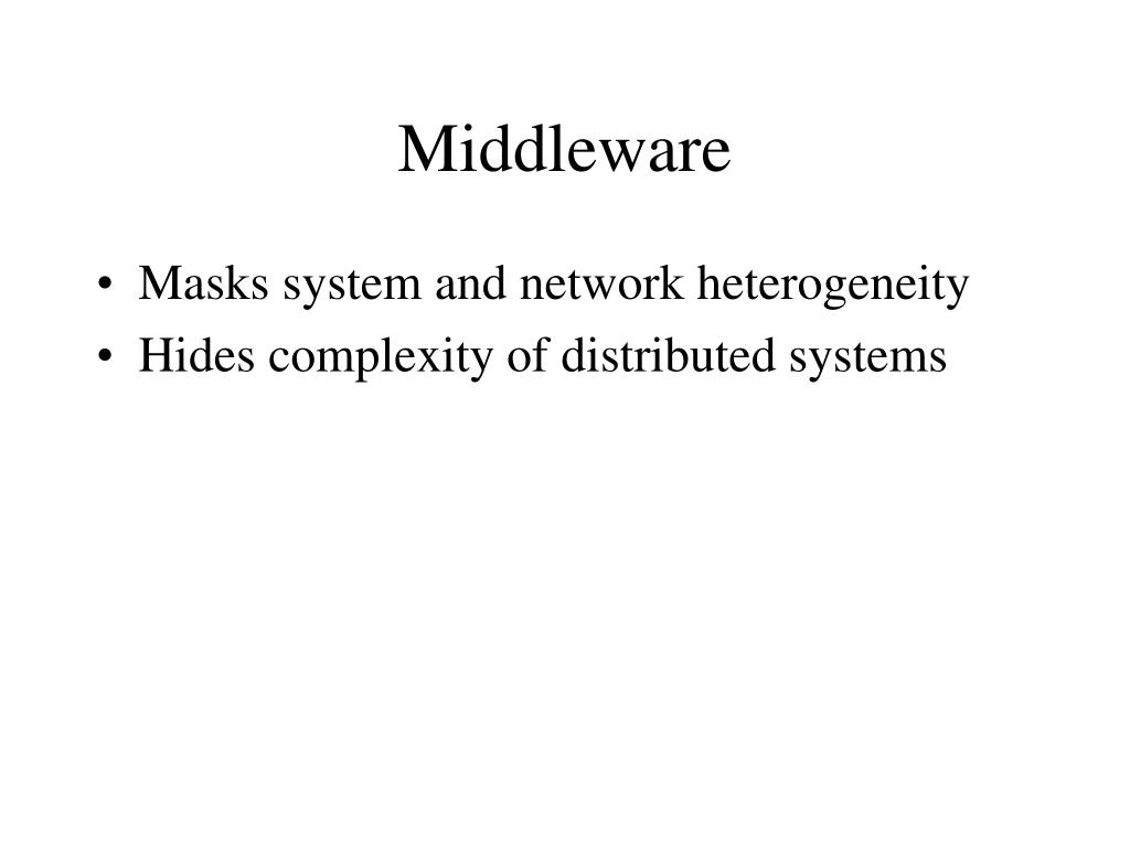 Middleware • Masks system and network heterogeneity • Hides complexity of distributed systems