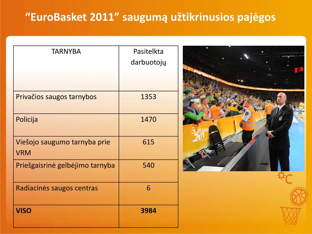 Atliktiparengiamieji darbai (2011): • Viešieji pirkimai ( komunikacijos, IT, saugumo, tarnsportavimo, maitinimo ir kt.) • Surengta EB 2011 burtų traukimo ceremonija • Pasirengimas čempionatui pristatytas “FIBA Europe” valdybai Sintroje (Portugalija) • „EuroBasket 2011” pristatymas užsienio šalyse (kartu su URM, EB ambasadorius A.Sabonis, aplankytos 9 šalys, EB pristatytas dviejose turizmo parodose Berlyne ir Maskvoje) • Bandomieji renginiai: LKF Final 4 ir Lietuvos vyrų rinktinėskontrolinės rungtynės Lietuvoje, “Global Games” (2011m. Panevėžys) ir kt. • Sukurtas ir pristatytas renginio himnas (oficiali daina) ir skanduotė • Sukurti ir pristatyti „EuroBasket 2011” medaliai • Pristatytos unikalios IT programos “Fan space”,„MokiPay“ • Sėkmingai įgyvendinti projektai: - Varom už Lietuvą! - 80000 kamuolių atplukdymas, transportavimas, jų pripūtimas ir pasiruošimas rekordo siekimui, dalyvių registracija) - Pasaulio mušinėjimo rekordo siekimas (60 000 kamuolių išdalinimas) • Oficialus „EuroBasket 2011” atidarymo renginys