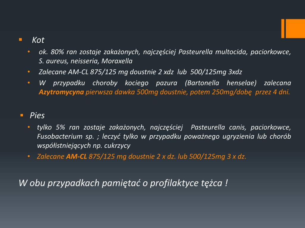 Kot • ok. 80% ran zostaje zakażonych, najczęściej Pasteurellamultocida, paciorkowce, S. aureus, neisseria, Moraxella • Zalecane AM-CL 875/125 mg doustnie 2 xdz lub 500/125mg 3xdz • W przypadku choroby kociego pazura (Bartonellahenselae) zalecana Azytromycyna pierwsza dawka 500mg doustnie, potem 250mg/dobę przez 4 dni. • Pies • tylko 5% ran zostaje zakażonych, najczęściej Pasteurellacanis, paciorkowce, Fusobacterium sp. ; leczyć tylko w przypadku poważnego ugryzienia lub chorób współistniejących np. cukrzycy • Zalecane AM-CL 875/125 mg doustnie 2 x dz. lub 500/125mg 3 x dz. W obu przypadkach pamiętać o profilaktyce tężca !
