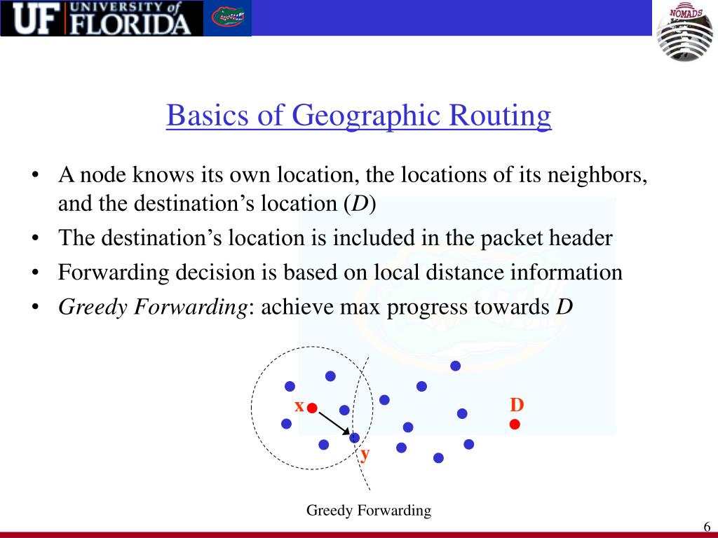 Basics of Geographic Routing • A node knows its own location, the locations of its neighbors, and the destination’s location (D) • The destination’s location is included in the packet header • Forwarding decision is based on local distance information • Greedy Forwarding: achieve max progress towards D x D y Greedy Forwarding