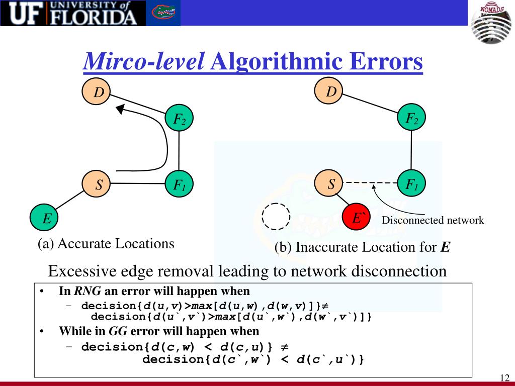 D D F F 2 2 S F S F 1 1 Disconnected network E ` E (a) Accurate Locations (b) Inaccurate Location for E Mirco-level Algorithmic Errors • In RNG an error will happen when • decision{d(u,v)>max[d(u,w),d(w,v)]} decision{d(u`,v`)>max[d(u`,w`),d(w`,v`)]} • While in GG error will happen when • decision{d(c,w) < d(c,u)} decision{d(c`,w`) < d(c`,u`)} Excessive edge removal leading to network disconnection