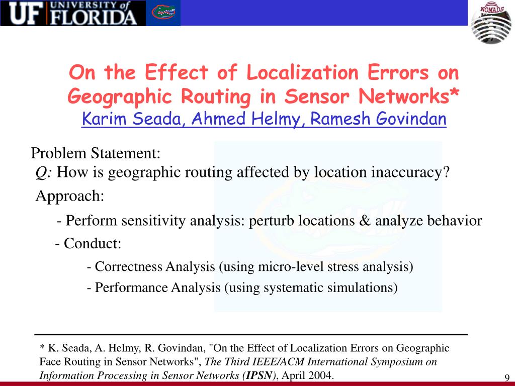 Problem Statement: On the Effect of Localization Errors on Geographic Routing in Sensor Networks*Karim Seada, Ahmed Helmy, Ramesh Govindan Q: How is geographic routing affected by location inaccuracy? Approach: - Perform sensitivity analysis: perturb locations & analyze behavior - Conduct: - Correctness Analysis (using micro-level stress analysis) - Performance Analysis (using systematic simulations) * K. Seada, A. Helmy, R. Govindan, "On the Effect of Localization Errors on Geographic Face Routing in Sensor Networks", The Third IEEE/ACM International Symposium on Information Processing in Sensor Networks (IPSN), April 2004.