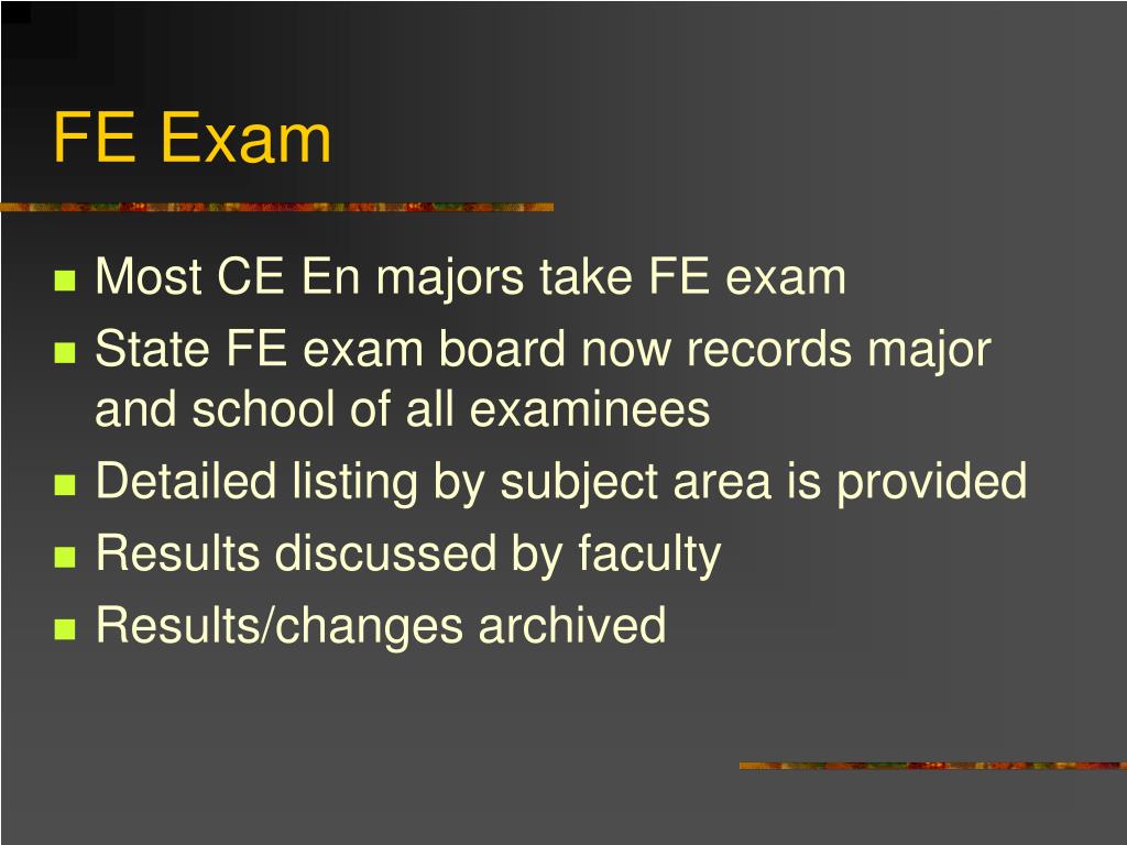 FE Exam • Most CE En majors take FE exam • State FE exam board now records major and school of all examinees • Detailed listing by subject area is provided • Results discussed by faculty • Results/changes archived