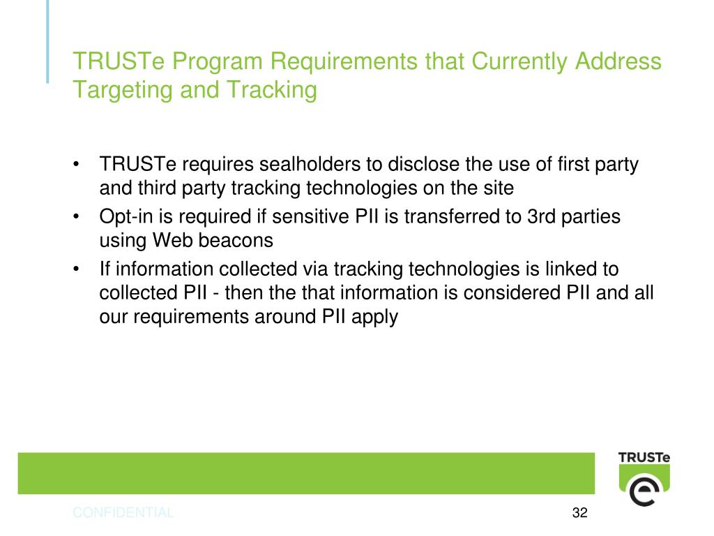TRUSTe Program Requirements that Currently Address Targeting and Tracking • TRUSTe requires sealholders to disclose the use of first party and third party tracking technologies on the site • Opt-in is required if sensitive PII is transferred to 3rd parties using Web beacons • If information collected via tracking technologies is linked to collected PII - then the that information is considered PII and all our requirements around PII apply CONFIDENTIAL