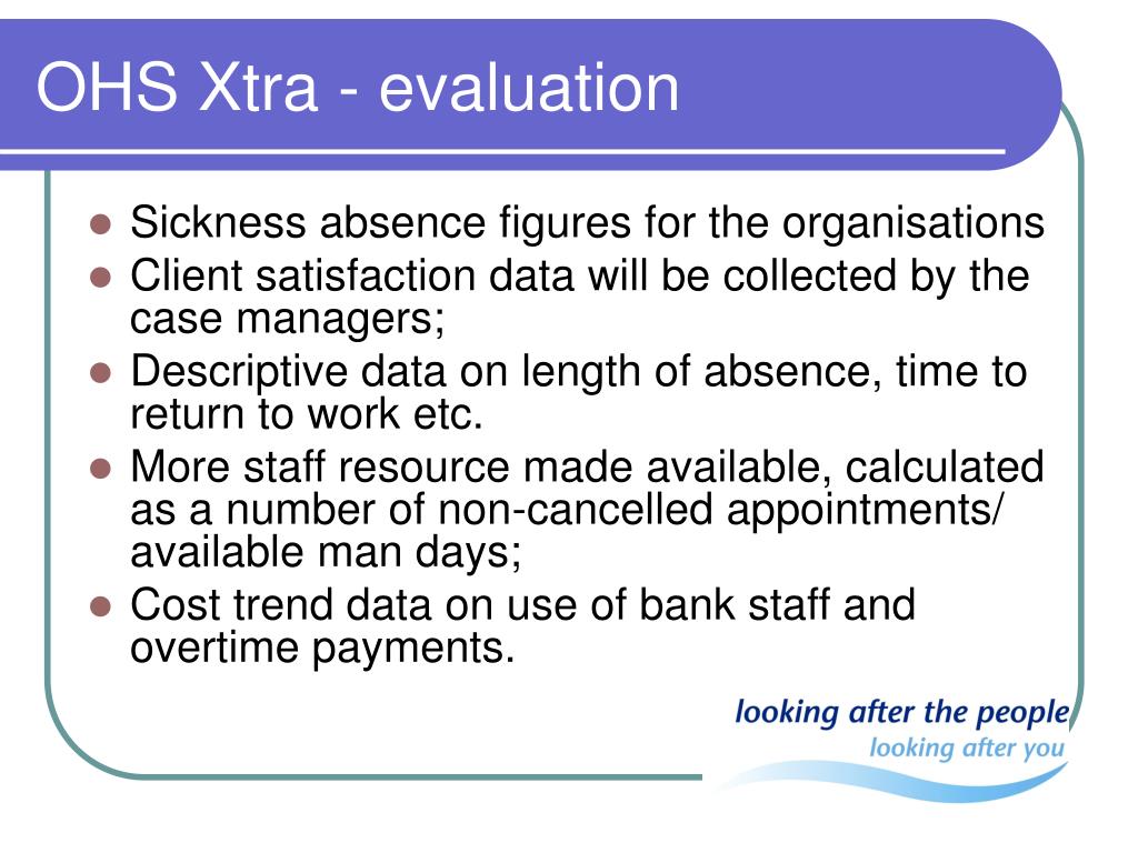 OHS Xtra - evaluation • Sickness absence figures for the organisations • Client satisfaction data will be collected by the case managers; • Descriptive data on length of absence, time to return to work etc. • More staff resource made available, calculated as a number of non-cancelled appointments/ available man days; • Cost trend data on use of bank staff and overtime payments.