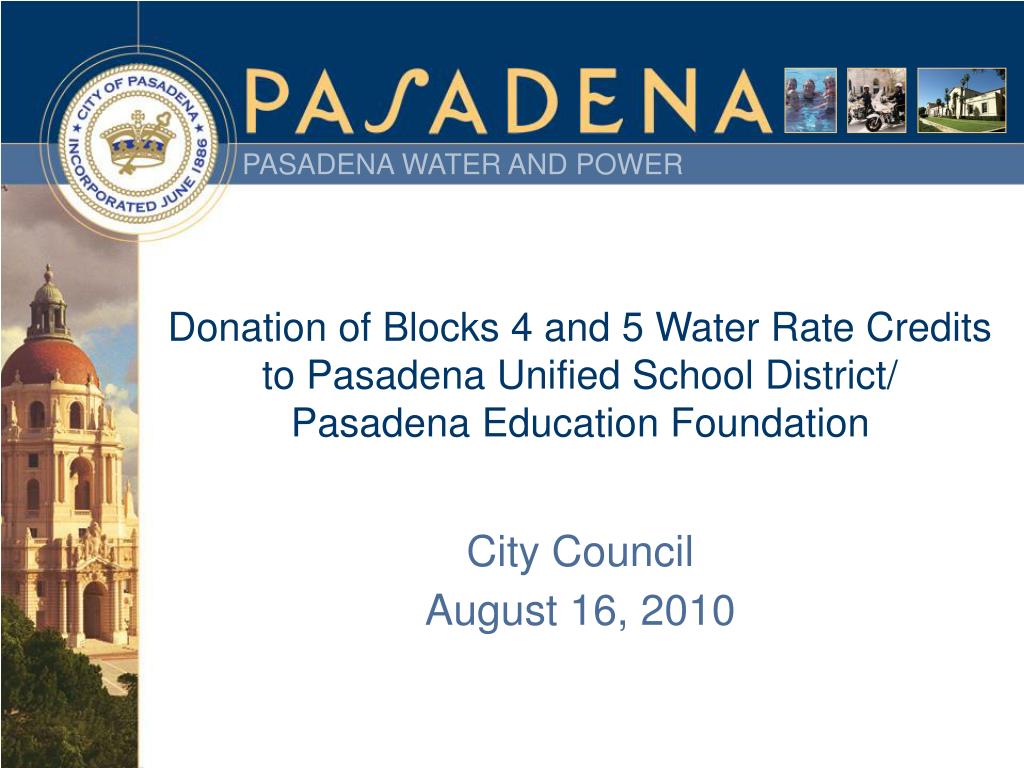 Donation of Blocks 4 and 5 Water Rate Credits to Pasadena Unified School District/ Pasadena Education Foundation City Council August 16, 2010