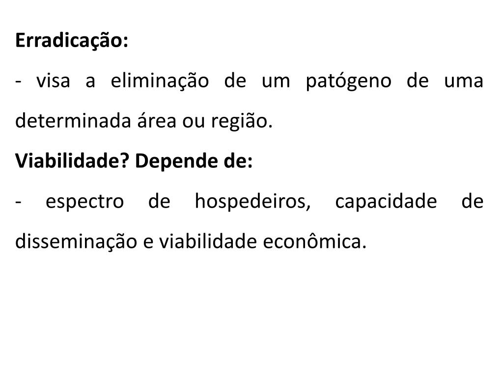Erradicação: - visa a eliminação de um patógeno de uma determinada área ou região. Viabilidade? Depende de: - espectro de hospedeiros, capacidade de disseminação e viabilidade econômica.