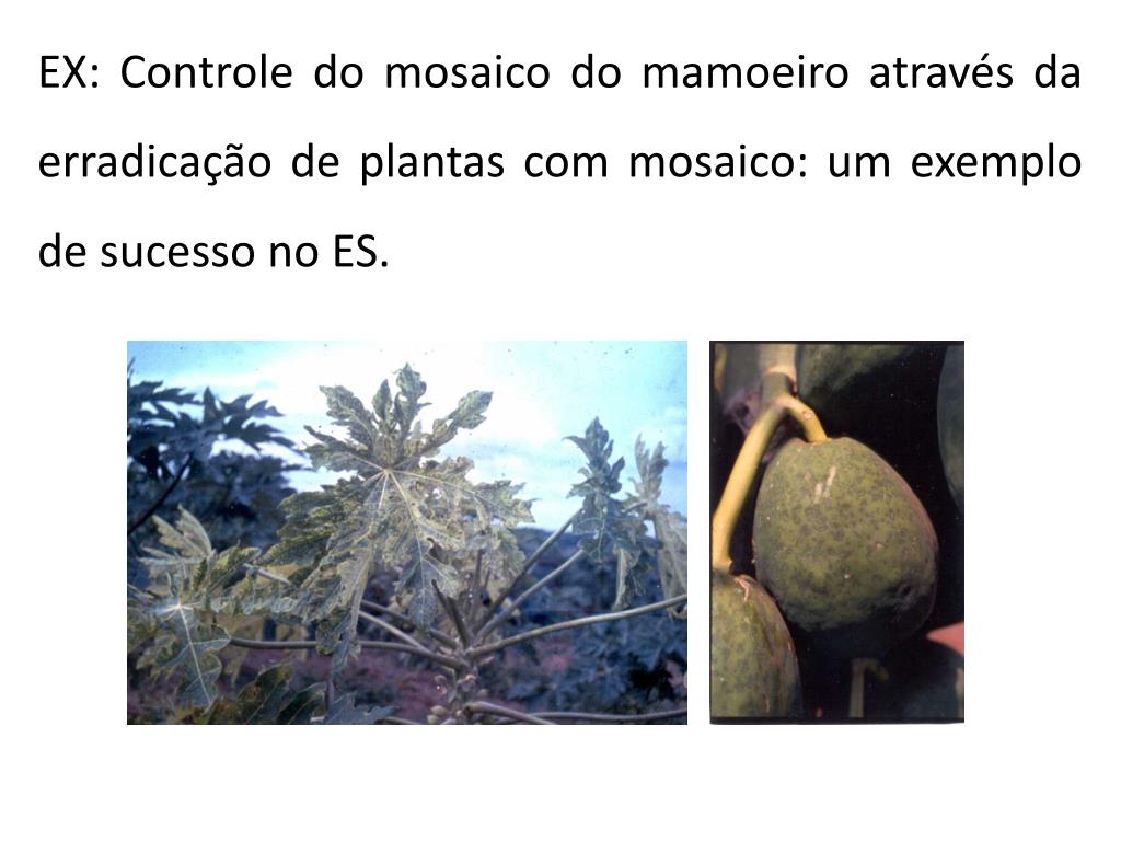 EX: Controle do mosaico do mamoeiro através da erradicação de plantas com mosaico: um exemplo de sucesso no ES.
