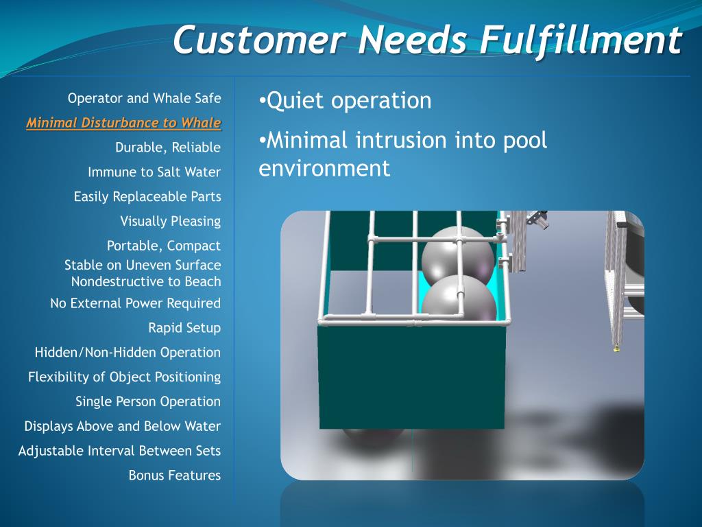 Customer Needs Fulfillment Operator and Whale Safe Minimal Disturbance to Whale Durable, Reliable Immune to Salt Water Easily Replaceable Parts Visually Pleasing Portable, Compact Stable on Uneven SurfaceNondestructive to Beach No External Power Required Rapid Setup Hidden/Non-Hidden Operation Flexibility of Object Positioning Single Person Operation Displays Above and Below Water Adjustable Interval Between Sets Bonus Features • Quiet operation • Minimal intrusion into pool environment