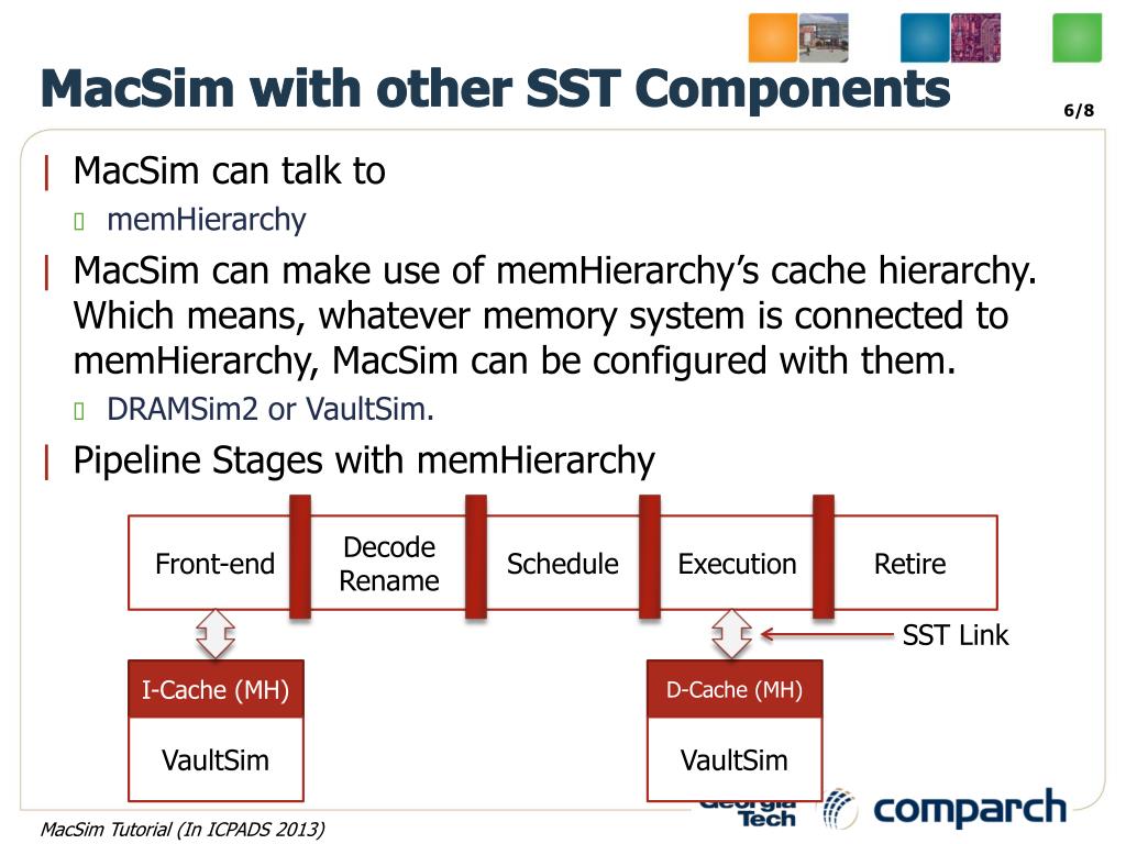 MacSim with other SST Components Front-end Decode Rename Schedule Execution Retire SST Link I-Cache (MH) D-Cache (MH) VaultSim VaultSim MacSim Tutorial (In ICPADS 2013) • MacSim can talk to • memHierarchy • MacSim can make use of memHierarchy’s cache hierarchy. Which means, whatever memory system is connectedto memHierarchy, MacSim can be configuredwith them. • DRAMSim2 or VaultSim. • Pipeline Stages with memHierarchy