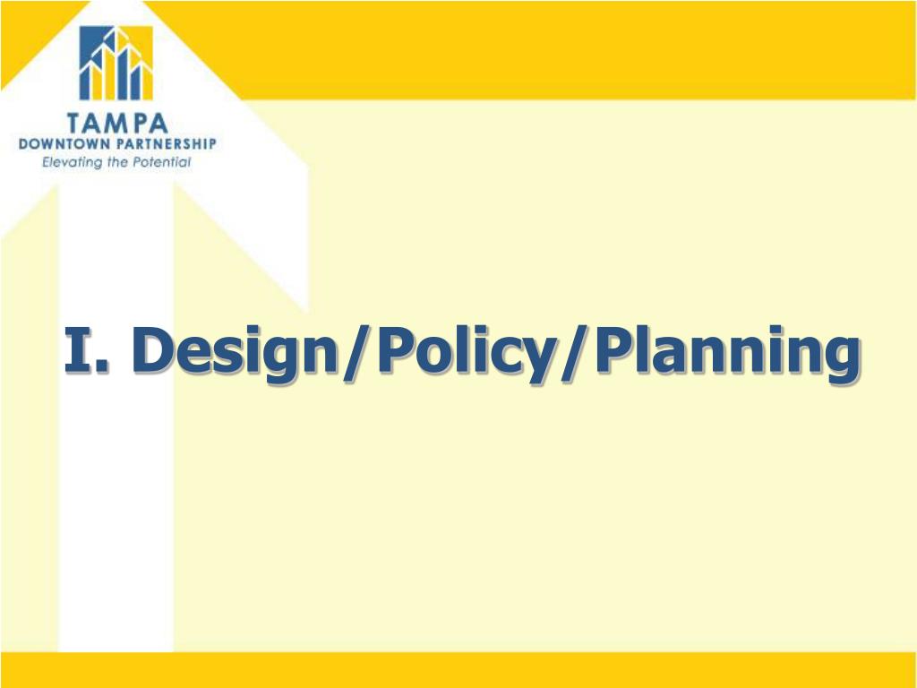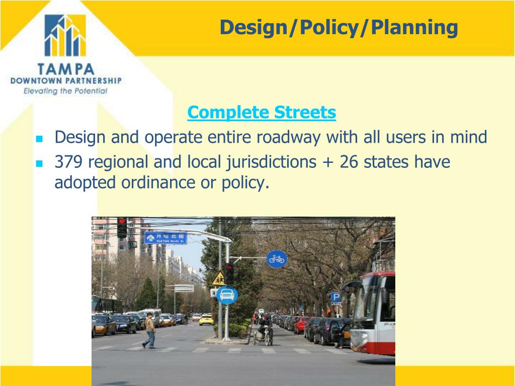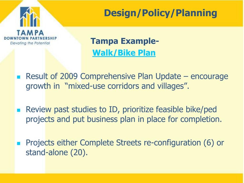 Design/Policy/Planning Tampa Example- Walk/Bike Plan • Result of 2009 Comprehensive Plan Update – encourage growth in “mixed-use corridors and villages”. • Review past studies to ID, prioritize feasible bike/ped projects and put business plan in place for completion. • Projects either Complete Streets re-configuration (6) or stand-alone (20).