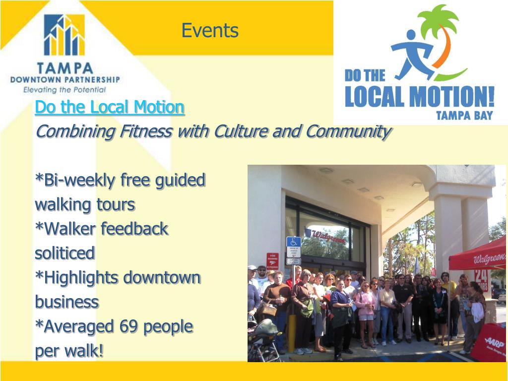 Events Do the Local Motion Combining Fitness with Culture and Community *Bi-weekly free guided walking tours *Walker feedback soliticed *Highlights downtown business *Averaged 69 people per walk!