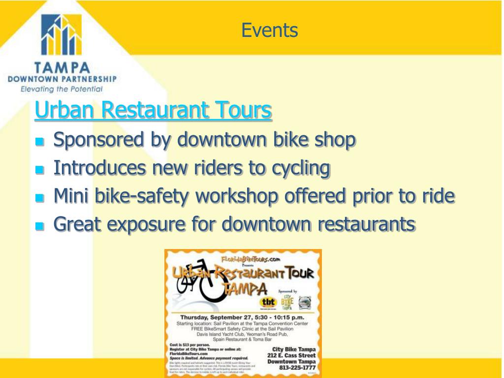 Events Urban Restaurant Tours • Sponsored by downtown bike shop • Introduces new riders to cycling • Mini bike-safety workshop offered prior to ride • Great exposure for downtown restaurants