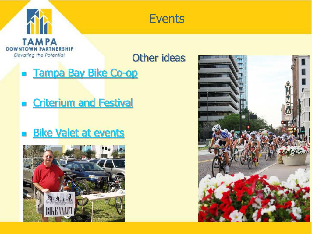 Events Other ideas • Tampa Bay Bike Co-op • Criterium and Festival • Bike Valet at events