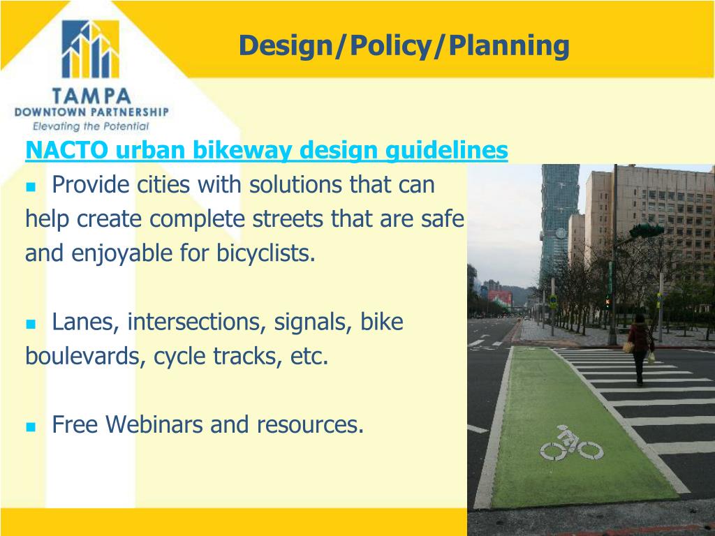 Design/Policy/Planning NACTO urban bikeway design guidelines • Provide cities withsolutions that can help create complete streets that are safe and enjoyable for bicyclists. • Lanes, intersections, signals, bike boulevards, cycle tracks, etc. • Free Webinars and resources.